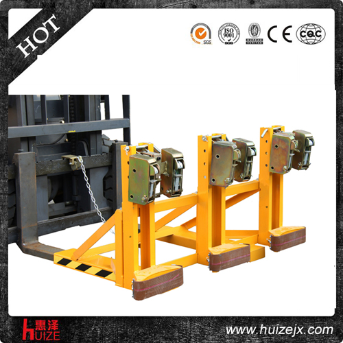 重型三油桶夾具單鷹嘴純機(jī)械機(jī)構(gòu)設(shè)計可與叉車方便地配合,僅依靠叉車的動作,不需要其它的動力,可自動一次搬運3個塑料油桶,  配置可拆換式柔性耐磨保護(hù)墊,有效保護(hù)油桶并緩沖叉車行駛過程中的震動能在集裝箱等這樣狹小的環(huán)境內(nèi)裝卸桶裝物質(zhì),可極大地提高空間利用率與貨叉連接配有自鎖裝置確保油桶夾在坡度上和顛簸路面使用時不會滑落.